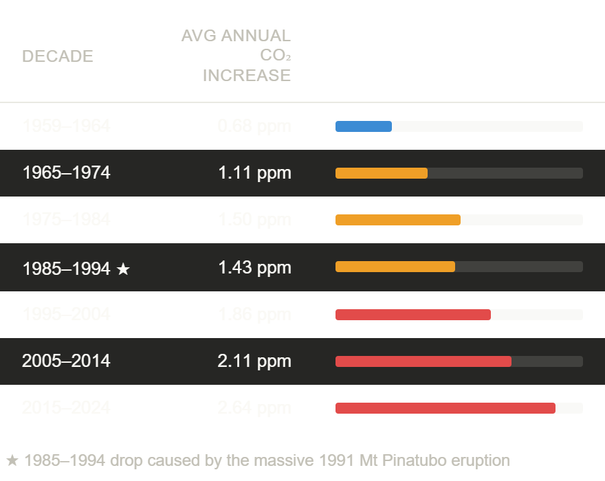 The CO2 level in 1750 was 280 parts per million (ppm). In May 2025, the CO2 level at Mauna Loa Observatory reached a high point of 428 ppm. The average annual increase of atmospheric CO2 by decade was as follows: