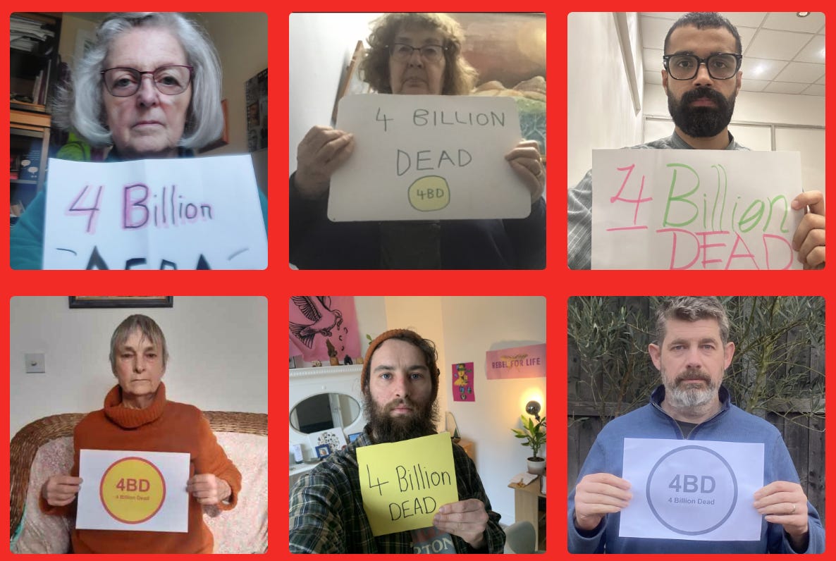 To provide the public with the truth about climate collapse, including the human and ecological consequences, we have established a new campaign: “4 Billion Dead” (4BD). Citizen activists will bring scientists, actuaries, insurance experts, and mass-death analysts together to inform the public about the true state of global overheating and its ecological and human consequences through regular, comprehensive, and understandable reports and online presentations. Extreme suffering is coming down the line, and regime collapse and mass death in the billions is virtually certain without the kind of emergency action that existing governments have been institutionally incapable of delivering. We need to anticipate and plan for worst-case scenarios as a basic matter of precaution.