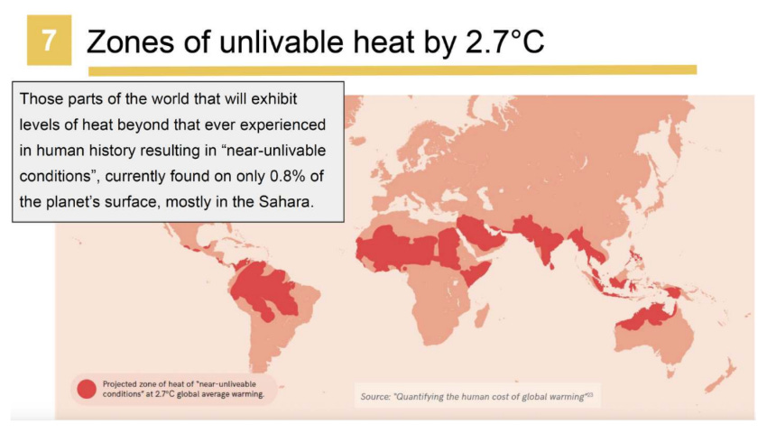 While there may be questions as to how soon, without question, temperature increases will lead to mass migration and mass death. For example, the Nature Sustainability map below illustrates zones of unlivable heat at 2.7°C (Nature, 2023, “Quantifying the Human Cost of Global Warming”).